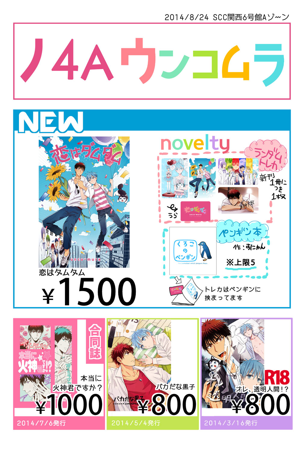 7月のオンリーに紺さんと佐藤と合同サークルで合同本出す~はず多分。紺さんが黒子で、佐藤が火神くんで、うんこぷが2号。